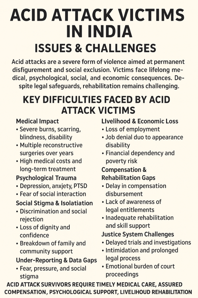 The provisions relating to acid attacks earlier contained in Sections 326A and 326B of the Indian Penal Code, 1860. Now stand incorporated under Sections 124 and 125 of the Bharatiya Nyaya Sanhita, 2023. Further, victim compensation, rehabilitation under Sections 357A, 357B and 357C of the Code of Criminal Procedure, 1973. Now correspondingly re-enacted under Sections 395, 396 and 397 of the Bharatiya Nagarik Suraksha Sanhita, 2023.