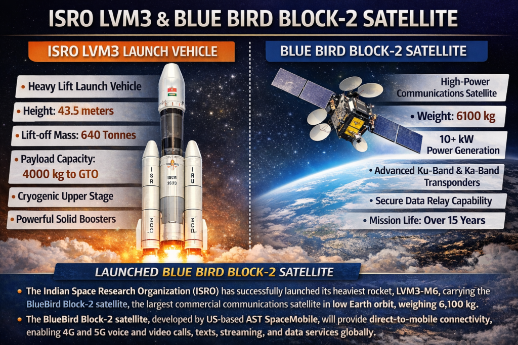 The Indian Space Research Organisation (ISRO) successfully launched a next-generation US communication satellite BlueBird Block-2. It was launched using Launch Vehicle Mark 3 (LVM3) — the country’s most powerful and heaviest rocket