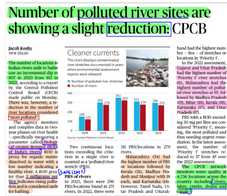 - The Central Pollution Control Board (CPCB) now lists 296 polluted river stretches (down from 311 in 2022 and 351 in 2018), with Maharashtra alone accounting for 54 stretches;